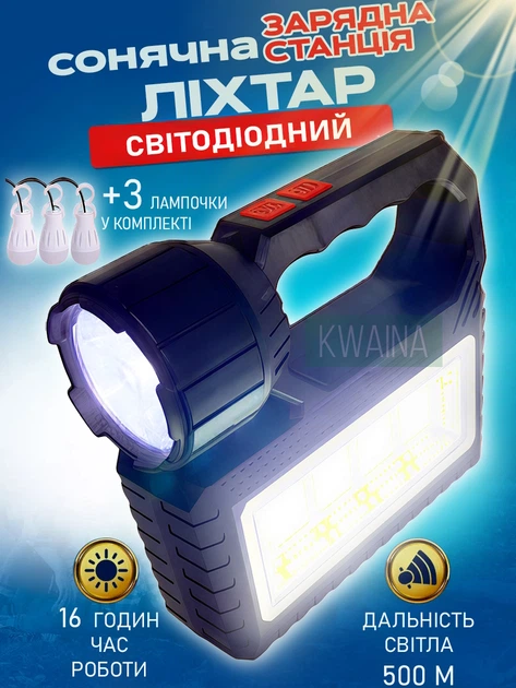 Система освітлення: ліхтар-станція на сонячній батареї з функцією Power Bank + 3 лампочки з вологозахистом IP65, Чорна