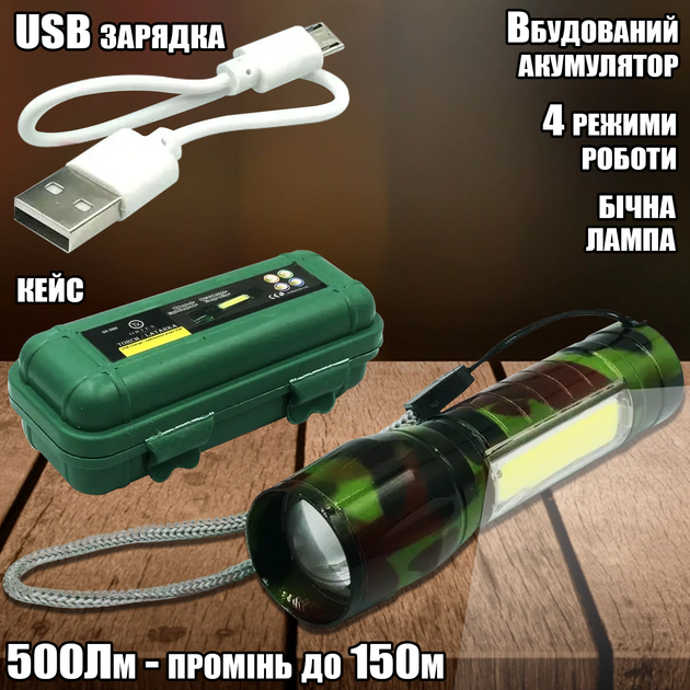 Кишеньковий акумуляторний LED ліхтарик XBalog DS500lm,Q5+COB 3 режими, вологозахищений Camouflage