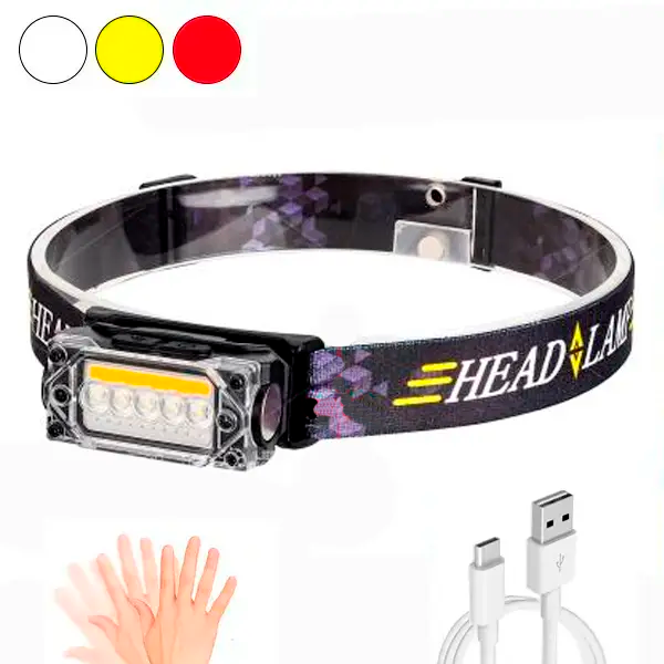 Налобний ліхтар YY-19С, 5SMD+COB, червоний, жовтий, білий, датчик руху, АКБ Li-Ion, магніт, ЗП Type-C