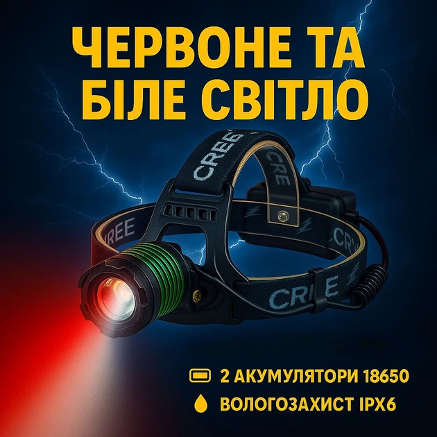 Ліхтар налобний Police 2XPE червоне та біле світло на акумуляторі зарядка USB