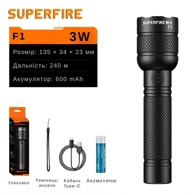 Компактний ручний ліхтарик з п’ятьма режимами роботи SuperFire F1