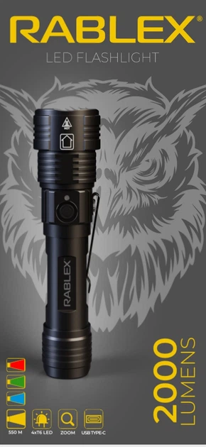 Ліхтарик ручний алюмінієвий RABLEX RB 915 4*Т6 Led (blue/red/green/white), 2000LM роз'єм type-c