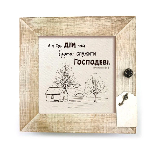 Декоративна дерев'яна ключниця-полотно 23х23 см "А я та дім мій" білий вінтаж