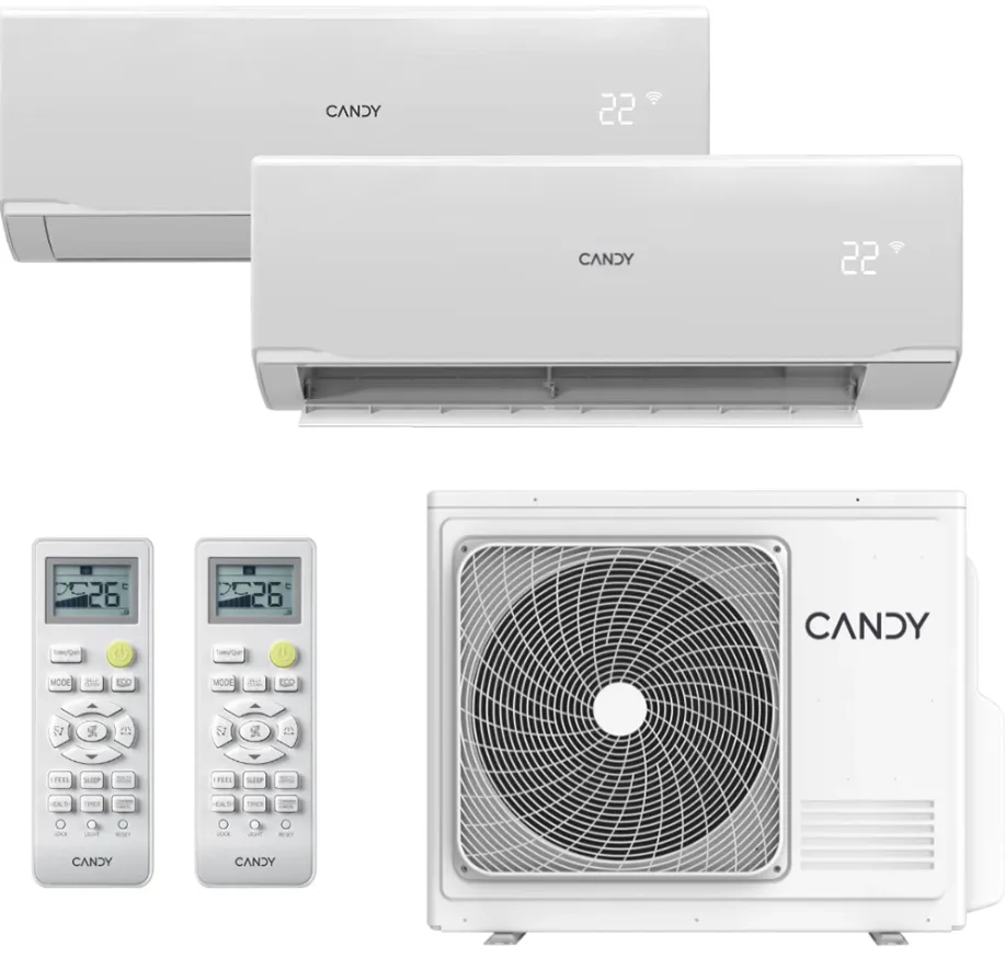 Мульти-спліт система Мульти-спліт система Candy — розумне рішення для тих, хто прагне комфорту в усьому домі без зайвих компромісів. Один зовнішній блок забезпечує роботу двох внутрішніх, даруючи ідеальний мікроклімат одразу в кількох кімнатах. Не лише економія простору на фасаді будинку, а й стиль, енергоефективність та зручність в управлінні. Ви отримуєте повний контроль над