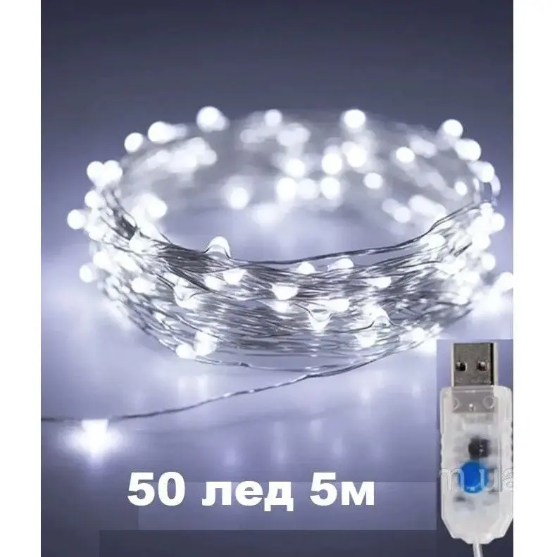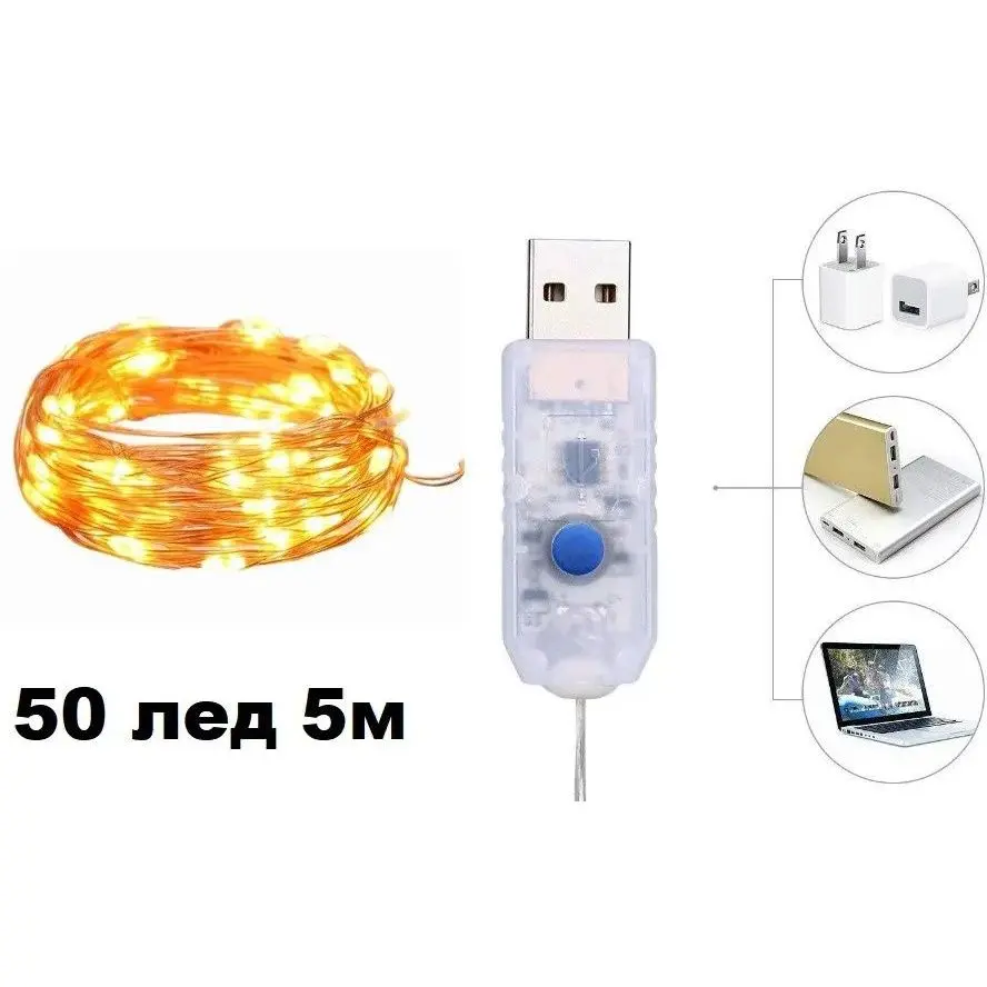 Світлодіодні гірлянди-вогники зі срібним дротом, 5 м, 50 LED, USB, тепле біле світло
