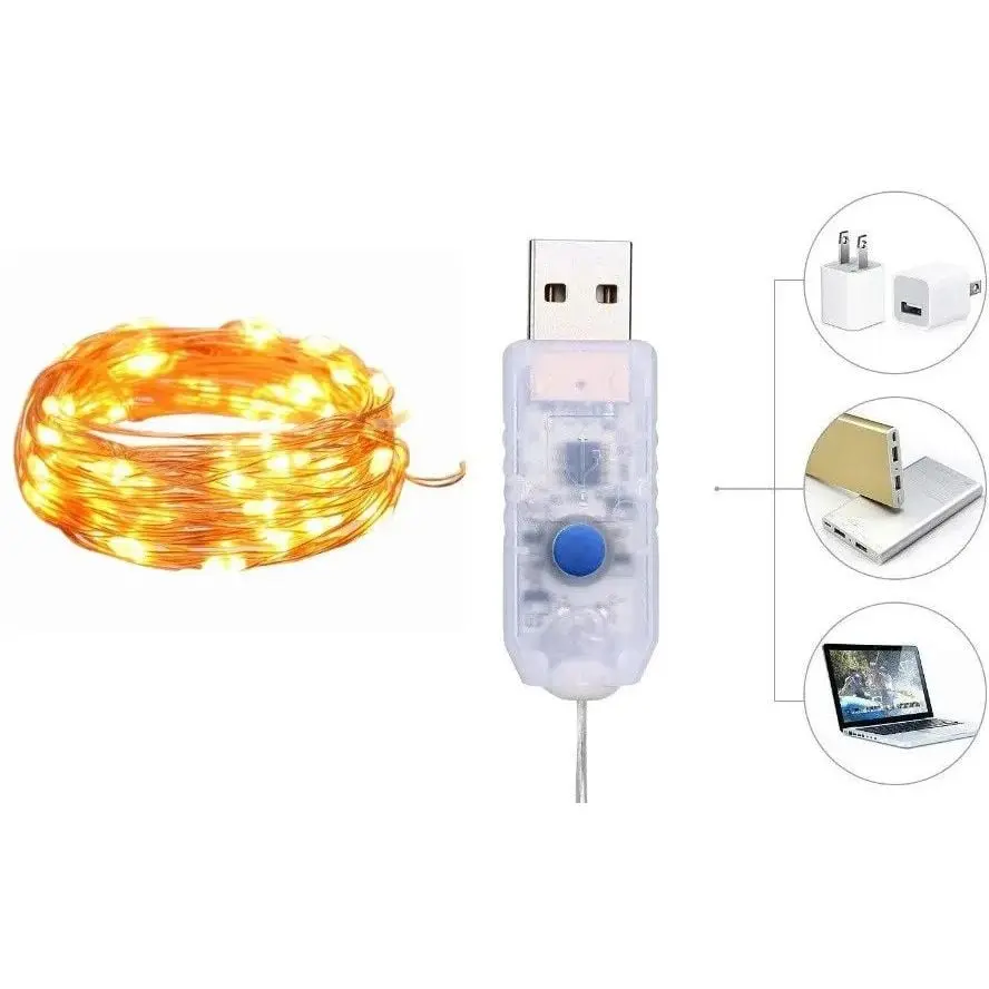 Світлодіодні гірлянди-вогники зі срібним дротом, 10 м, 100 LED, USB, тепле біле світло