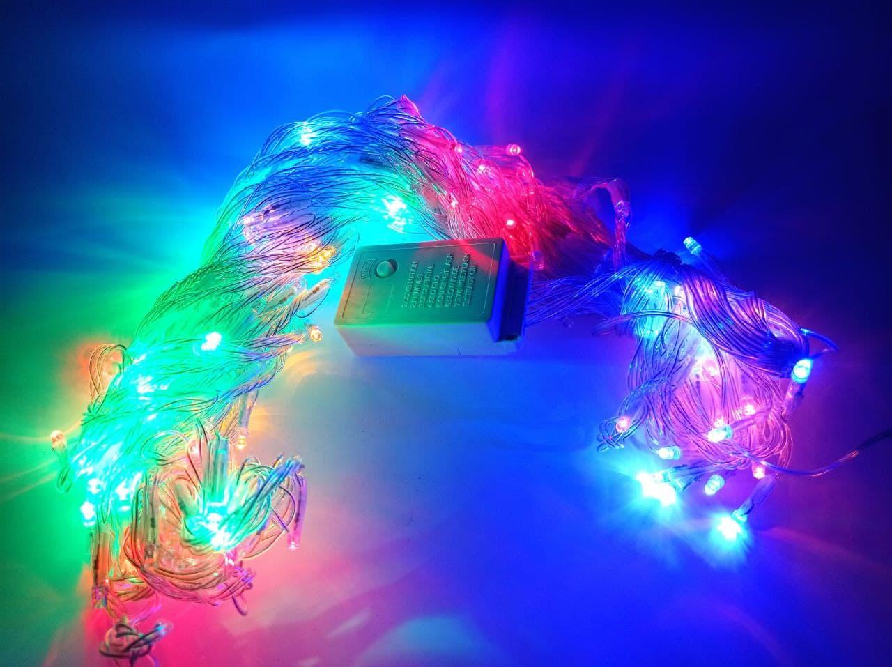 Гирлянда для внутреннего использования, размер 2 на 2 метра, 240 лед ламп. Есть возможность соединения. Цвет свечения холодный разноцветный, 8 режимов свечения. Высота лампочки 2,5см.