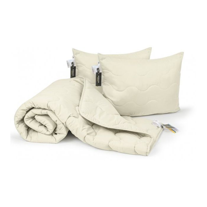 Тип - демісезонні, Розмір - 220 x 240 см, Наповнювач - вовна, ковдра: 70% натуральна овеча вовна, 30% поліефірний розпушувач подушка: 70% натуральна овеча вовна, 30% поліефірний розпушувач, мікросатин, Колір - білий