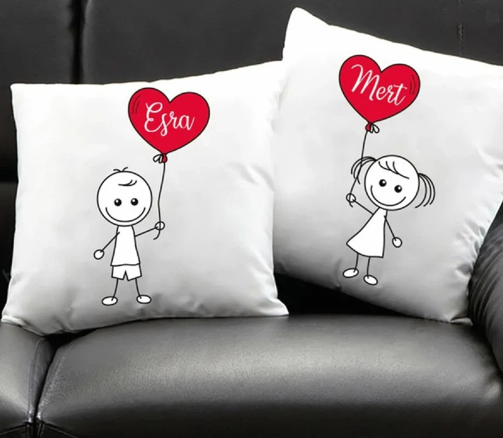 Парні декоративні подушки з принтом "Хлопчик і дівчинка з кульками-сердечками"
