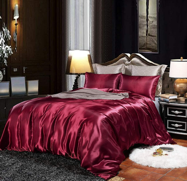 Постільна білизна атласна Двоспальний 180 x 210 см з простирадлом на гумці наволочка 2х70х70 Бордовий (В141402-1)