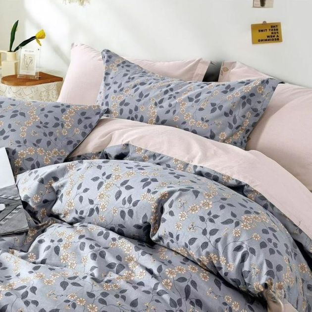 Постільна білизна двоспальна євро світло-блакитна з світло-сірим Квіти Сатин Ananasko 44376