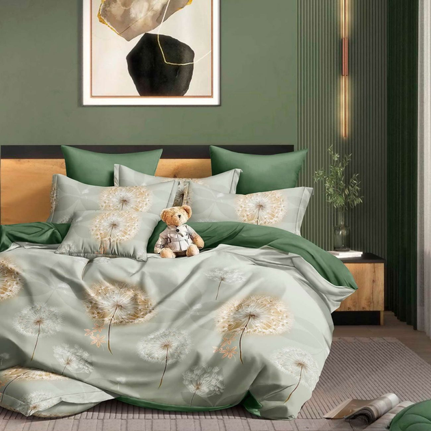Постільна білизна двоспальна євро сіра з зеленим Кульбаби Сатин Ananasko 44407