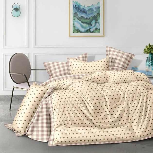 Постільна Білизна Бежева Картаті Сердечки Сатин Наволочки Простирадло Підковдра Комплект Євро (371770)