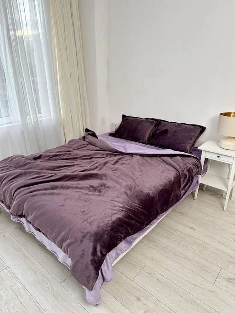 Постільна білизна з гумкою плюшева однотонна Баклажан + бузковий, євро розмір 200х220 см, наволочки 70х70