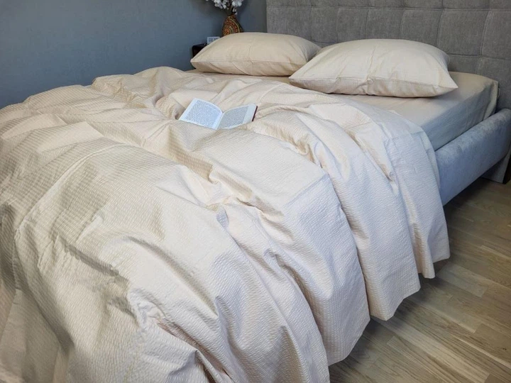 Постільна білизна з резинкою Світлий беж GS109, ранфорс гофра (жатка) Евро розмір, наволочки 70/70