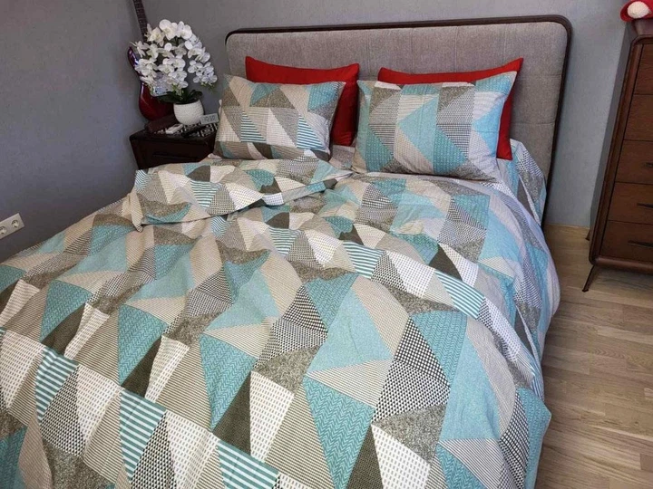 Постільна білизна з гумкою тепла Печворк бірюзовий, євро розмір 200х220 см, турецька фланель преміум (байка), наволочки 50х7