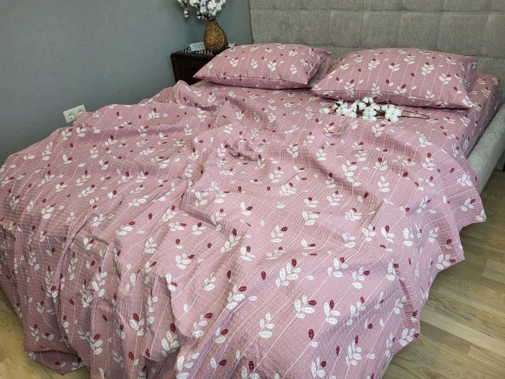Постільна білизна з гумкою Вербена рожевий євро розмір 200х220 см, жатка, турецький ранфорс гофре , наволочки 50х70, 100 бав