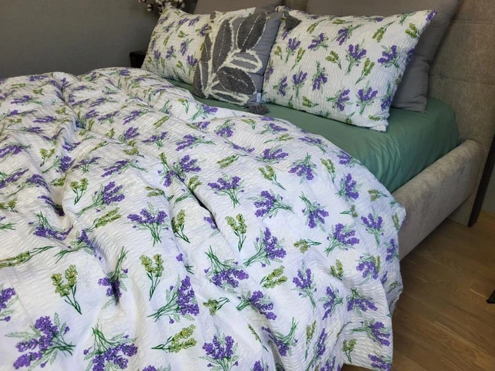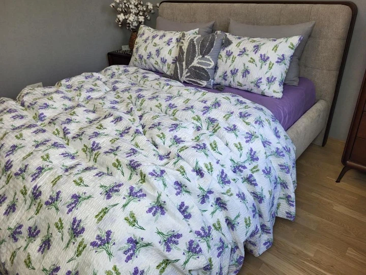 Постільна білизна з резинкою Ніжність лаванди, ранфорс гофра (жатка) Полуторний розмір, наволочки 50/70
