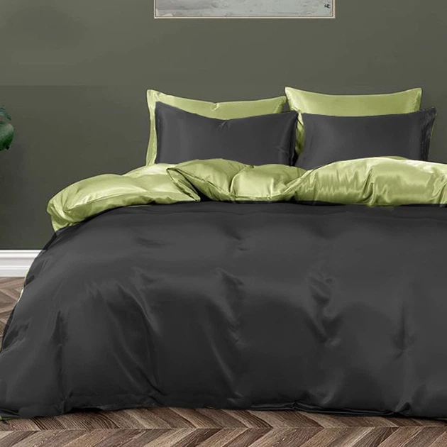 Комплект постільної білизни MERISET 120091195 Двоспальний на резинці Сатин однотон Антрацит, Салатовий