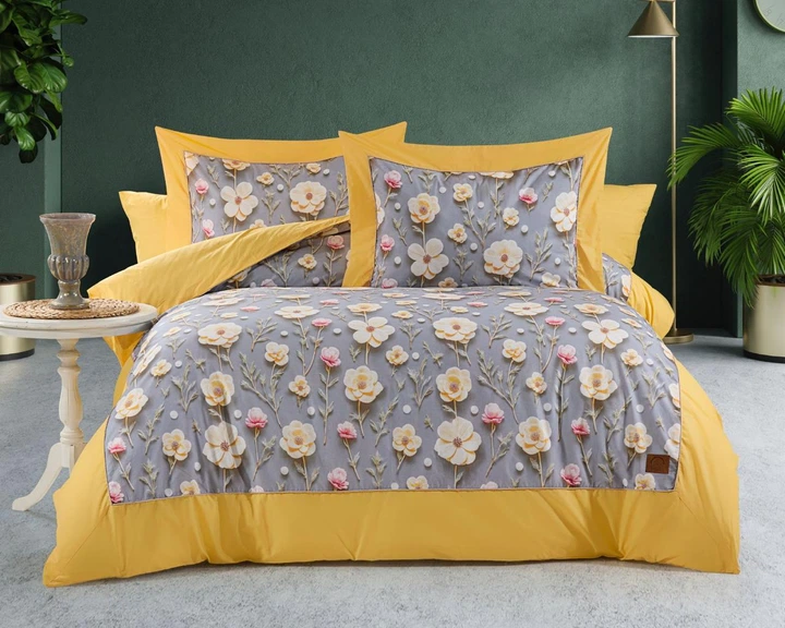 Комплект постільної білизни Romeo home Vanguard 5D з попліну в євро розмірі жовтий\сірий з квітами 00012000