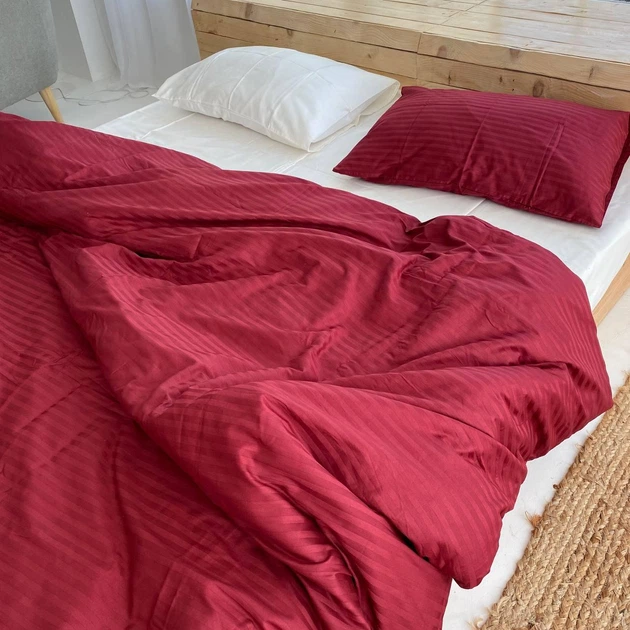 Постільна білизна Молочний однотонний + Бордо страйп сатин PREMIUM Евро розмір, наволочки 70/70