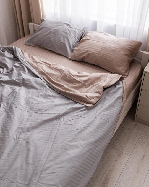Постільна білизна Асвальтний + беж страйп сатин PREMIUM Евро розмір, наволочки 70/70