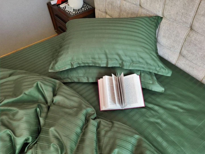 Постільна білизна Мульти страйп сатин зелений мох, PREMIUM Евро розмір, наволочки 70/70
