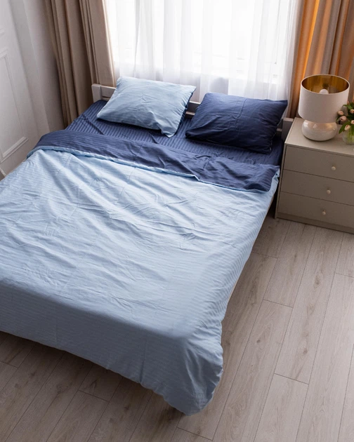 Постільна білизна Голубий + синій страйп сатин PREMIUM Евро розмір, наволочки 50/70