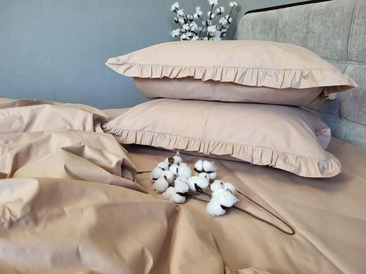 Постільна білизна з резинкою Беж з рюшею, ранфорс Полуторний розмір, наволочки 70/70