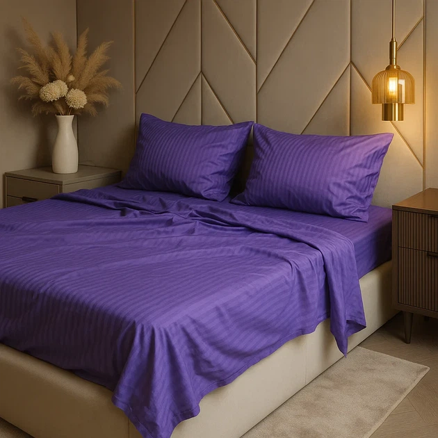 Постільна білизна “Патагонський Люпин” із страйп-сатину – євро, простирадло на гумці, наволочки 7070, у коробці з мішечком