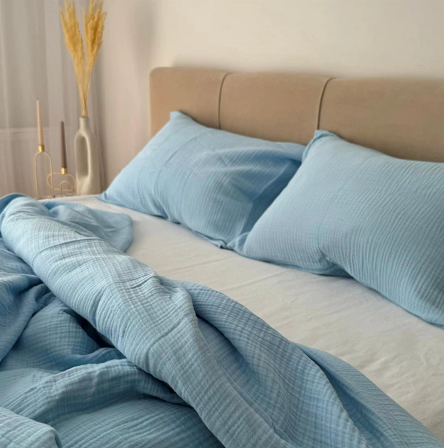 Комплект з преміального 4-х шарового мусліну LavSon Євро 200х220 Блакитний простирадло 240х230 ранфорс Білий