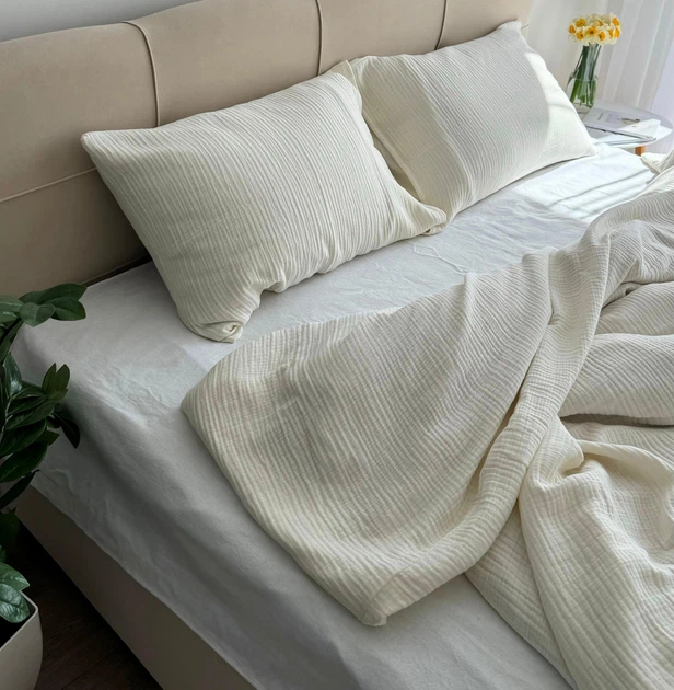 Комплект з преміального 4-х шарового мусліну LavSon Євро 200х220 Молочний простирадло 240х230 ранфорс Білий