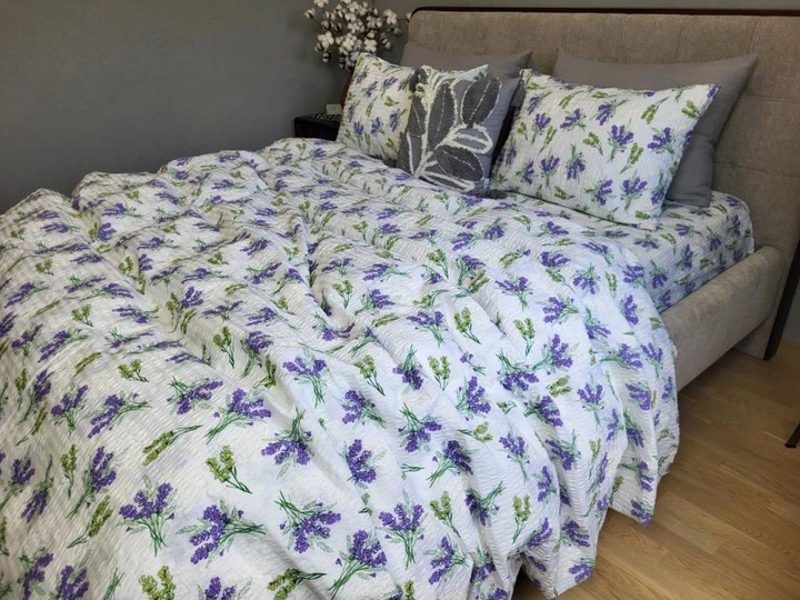 Постільна білизна з резинкою Ніжність лаванди, ранфорс гофра (жатка) Сімейний розмір, наволочки 70/70