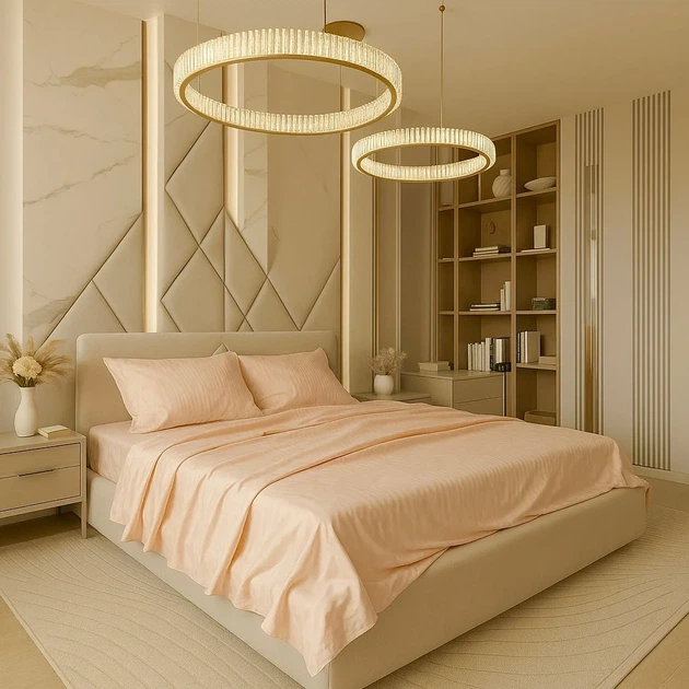 Постільна білизна "Персикова Суфле" зі страйп-сатину - сімейний, простирадло звичайне, наволочки 5070, в коробці з мішечком
