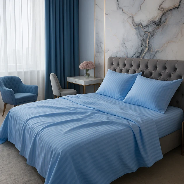 Постільна білизна "Сапфірове Небо" з мерсеризованого страйп-сатину - сімейний, простирадло на гумці, наволочки 5070, в короб
