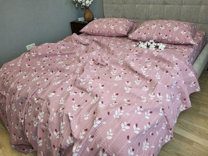 Постільна білизна з гумкою Вербена рожевий євро розмір 200х220 см, жатка, турецький ранфорс гофре , наволочки 70х70, 100 бав