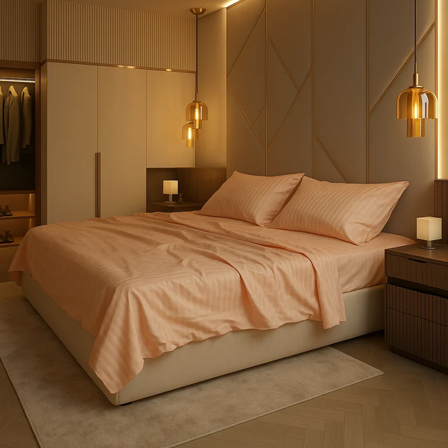 Постільна білизна "Персикова Суфле" зі страйп-сатину - двоспальний, простирадло звичайне, наволочки 7070, в коробці з мішечк