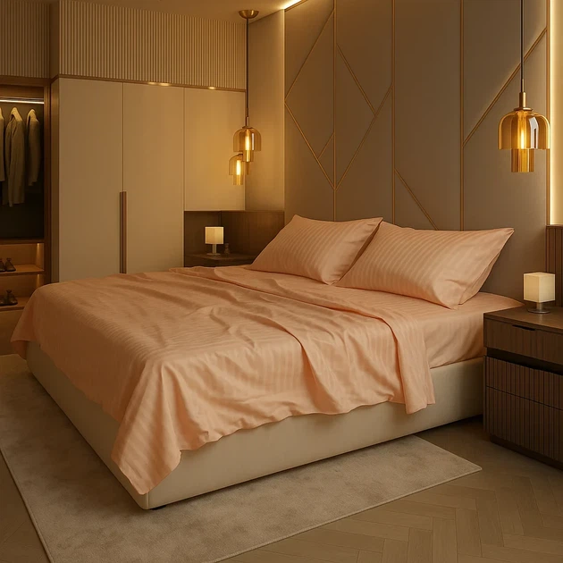 Постільна білизна "Персикова Суфле" зі страйп-сатину - сімейний, простирадло звичайне, наволочки 7070, в коробці з мішечком
