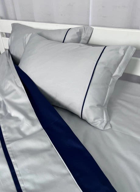 Постільна білизна "Синій Шепіт" зі страйп-сатину - сімейний, простирадло звичайне, наволочки 7070, в коробці з мішечком