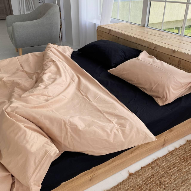 Постільна білизна з резинкою Бежевий + чорний, ранфорс Евро розмір, наволочки 50/70