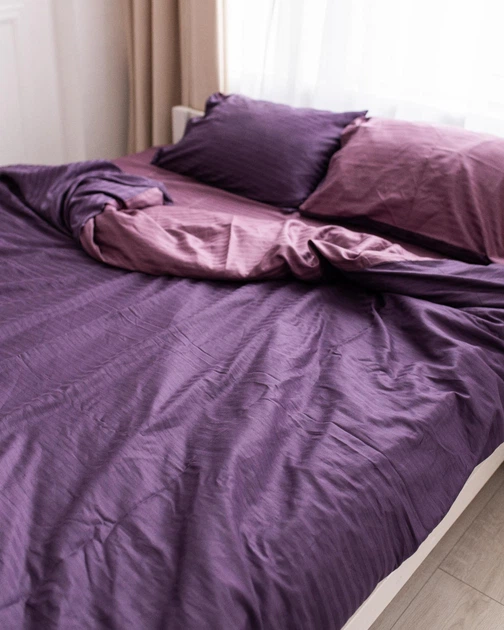 Постільна білизна з резинкою Слива + фіолетовий страйп сатин PREMIUM Сімейний розмір, наволочки 70/70