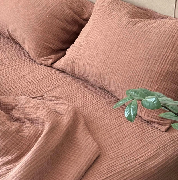 Комплект з преміального 4-х шарового мусліну LavSon Сімейний 2х - 150х220 з простирадлом на гумці 200х200х30 Какао