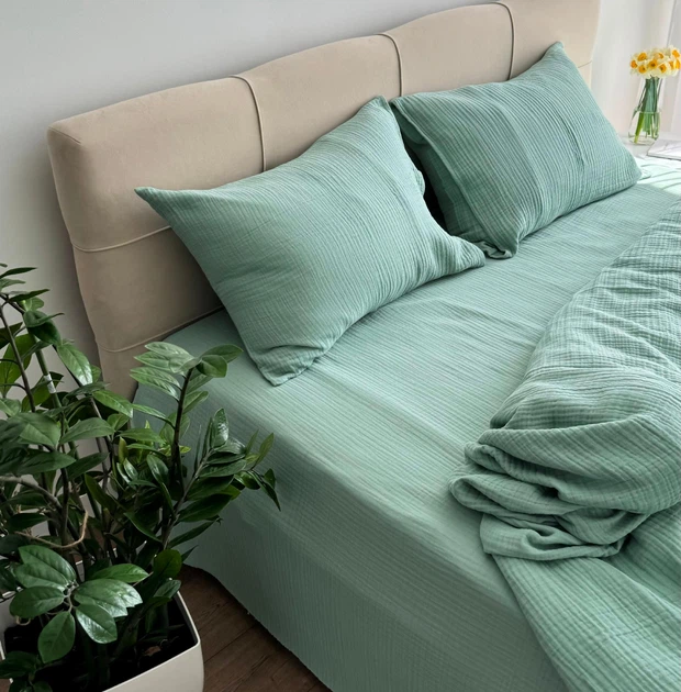 Комплект з преміального 4-х шарового мусліну LavSon Сімейний 2х - 150х220 з простирадлом на гумці 200х200х30 М'ята