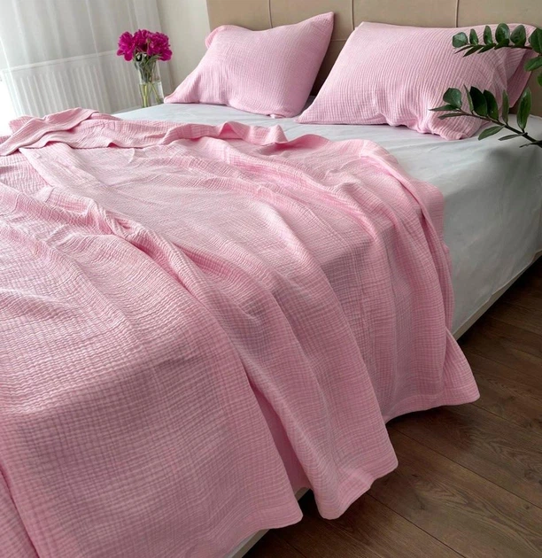 Літній комплект з преміальним мусліном LavSon 4-х шаровий Муслін Сімейний 2х - 150х240 Рожевий з простирадлом на гумці Ранфо
