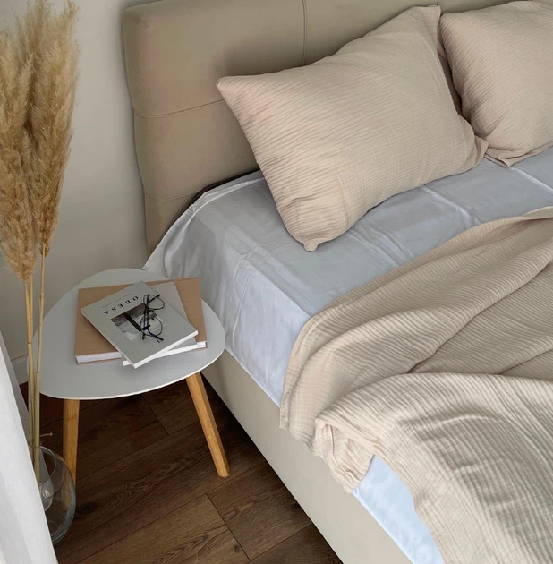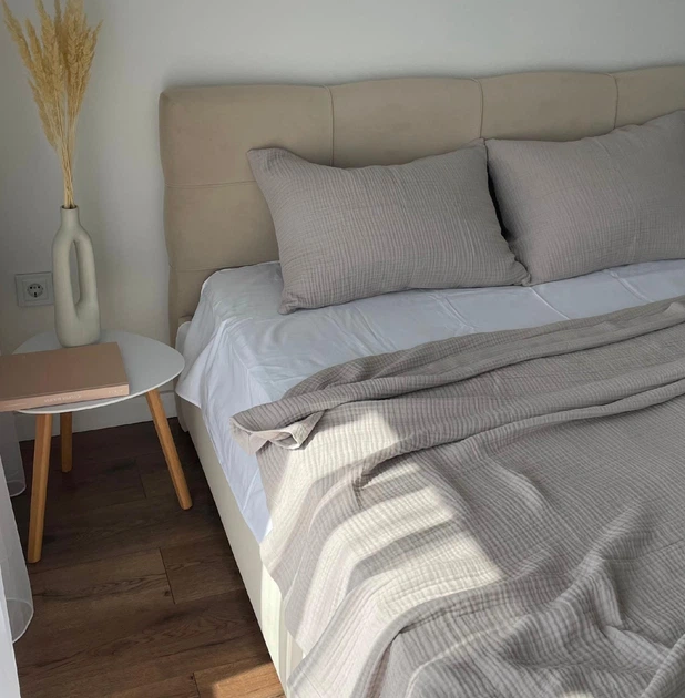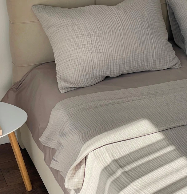 Літній комплект з преміальним мусліном LavSon 4-х шаровий Муслін Сімейний 2х - 150х240 Бежевий з простирадлом на гумці Ранфо