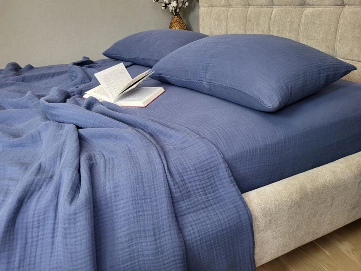 Постільна білизна з резинкою Синій, муслін Полуторний розмір, наволочки 50/70