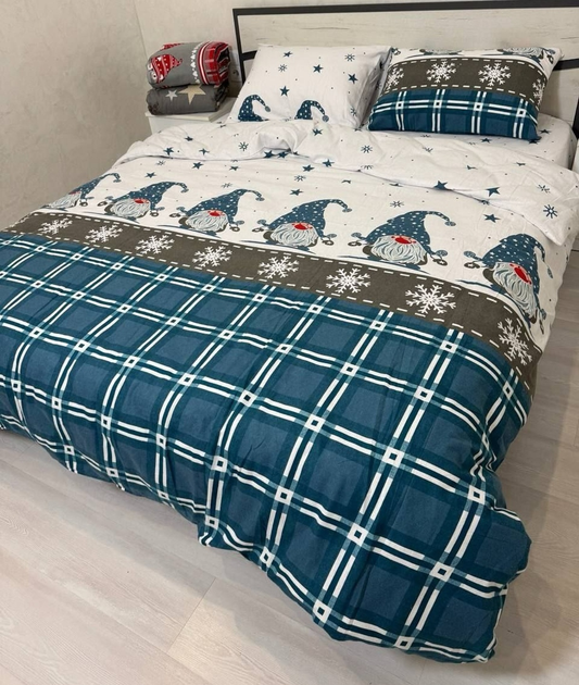 Новорічний комплект постільної білизни Гноми синя клітинка бязь gold полуторний