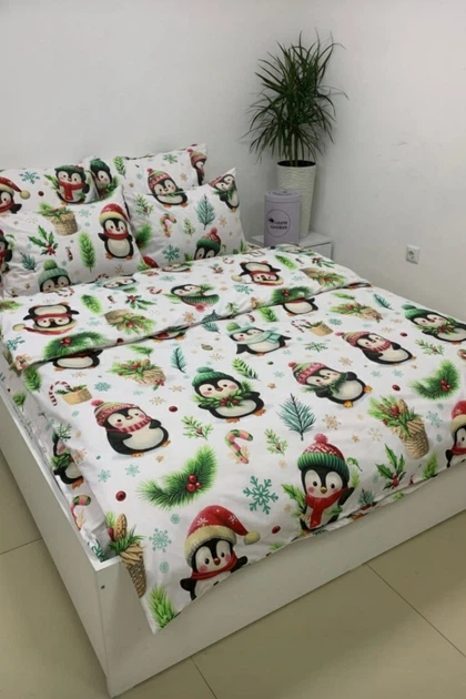 Новорічний комплект постільної білизни Веселі пінгвіни бязь gold двоспальний
