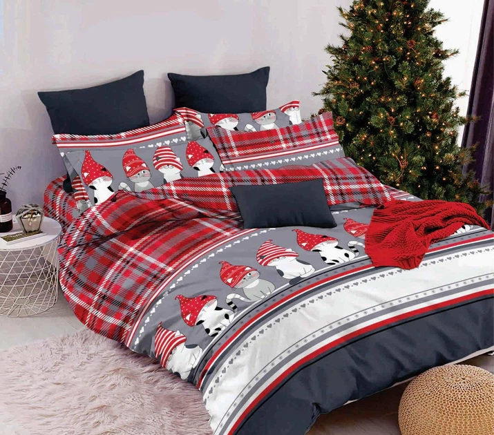 Комплект постільної білизни Новорічний Коти двоспальний 180*215 Бязь Голд Люкс Сіро червоний