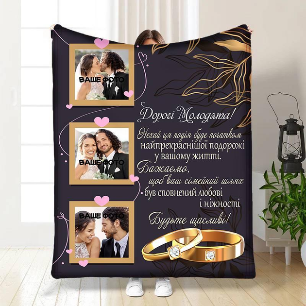 Індивідуальний плед на 3 фото Весільний:Дорогим Молодятам з 3D малюнком розмір 135х160